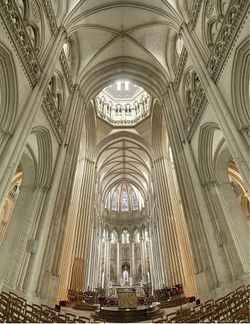 ولقد اخترنا كنيسة تشارتر لتمثيل العمارة القوطية الناضجة أو المتشعبة، وليس من واجبنا أن نعمد إلى هذه الإطالة نفسها في الحديث عن الكنائس ريمس، وأمين، وبوفيه. ولكن منذا الذي يستطيع أن يمر مسرعاً بالواجهة الغربية من كنيسة ريمس؟ وو أن الشماريخ الأصلية ظلت حتى الآن قائمة فوق الأبراج لكانت هذه الواجهة أعظم ما قام به الإنسان من أعمال، وإنا لتدهشنا وحدة الطراز وأجزاء الكنيسة المختلفة وتناسقها في بناء أقامته ستة أجيال من الناس. فقد دمرت النار في عام 1210 الكثدرائية التي أتمها هنكمار Hincmar في عام 840 ، وبدئت في يوم الذكرى الأولى لهذا الحريق كثدرائية جديدة من تصميم ربرت دي كوسي Robert de Coucy وجان دوربيه Jean dorbais. تليق بأن يتوج فيها ملوك فرنسا. ودام العمل أربعين عاماً نفد بعدها المال، فوقف البناء (1251)، ولم تتم الكنيسة العظيمة إلا في عام 1427. ودمرت النار في عام 1480 شماريخ الأبراج، واستخدمت أموال الكثدرائية المدخرة في ترميم البناء الرئيسي، أما الأبراج فلم يجدد بناؤها. ودمرت القنابل في الحرب العالمية الأولى عدداً من مساند الجدران وأحدثت فجوات كبيرة في السقف وفي القبة، ودمرت النار السقف الخارجي وحطمت كثيراً من التماثيل، ودمرت جماعات من المتعصبين عدداً آخر من الصور، وعدا الزمان على بعضها الآخر فأبلاه ذلك أن التاريخ صراع بين الفن وعوادي الأيام.