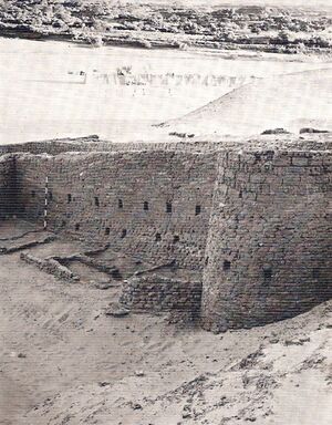 Fortifications within Ancient Egypt were built in times of conflict between rival principalities.[52] Out of all fortresses analyzed within this time frame, most (if not all) were built of the same materials. The only exception to the rule were some fortresses from the Old Kingdom as fortresses such as the fort of Buhen utilized stone with the creation of its walls. The main walls were mainly built with mud brick but were reinforced with other materials such as timber. Rocks were also utilized to not only preserve them from erosion as well as paving.[52] Secondary walls would be built outside of fortresses main walls and were relatively close to one another. As a result, this would prove to be a challenge to invaders as they were forced to destroy this fortification before they could reach the main walls of the fort.[53] Another strategy was utilized if the enemy managed to break through the first barrier. Upon making it to the main wall, a ditch would be constructed that would be positioned between the secondary and first walls. The purpose of this was to place the enemy in a position that would leave them exposed to the enemy, making the invaders susceptible to arrow fire.[53] The position of this ditch walls within the interior of fortresses would become demilitarized during times of unity; leading to them being demolished. The parts that were used to construct said walls could then be reused, making the overall design extremely beneficial.
