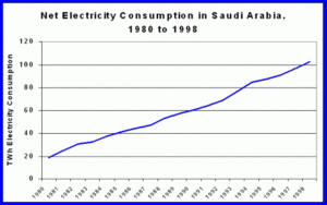 ونظراً لانخفاضِ أسعارِ الطاقة نسبياً فقد كانَ الطلبُ على الكهرباء في المملكة غير مقيد في الماضي، أي أنّه لا يوجد نظام تحكم بأسعارِ الطاقة وحيث لم تدخل مفاهيم ترشيد الطاقة آنذاك. وقد بلغت ذروة الطاقة المستهلكة واقتربت إلى حدٍّ كبير من حجمِ القدرةِ المركّبة في عام 1999م ممّا أدّى إلى انقطاعِ الكهرباء في فترات معينة من صيفِ ذلك العام، وقد ازدادَ الطلبُ على الطاقة ازدياداً غير متوقع مما تسبّب ذلك إلى مضاعفةِ الطلب على الكهرباء بمعدّل رقمين متتاليين في الزيادة السنوية، وبنفس الأسلوب ارتفعت ذروة استهلاك الطاقة بنفس الزيادة السابقة، أنظر إلى الجدولِ المرفق وشكل (1). وعلى أية حالٍ في الخمس سنوات الماضية ارتفعت أسعارُ الطاقة بمعدّل أكثر من 30٪ لكل من النفطِ ومشتقاته والكهرباء معاً، وهذا بدورهِ أدّى إلى التفكيرِ جدياً في تشجيعِ مفاهيم المحافظة على الطاقة وترشيدها. يوضحُ شكل (2) ثلاث تنبؤات (سيناريوهات) للطاقة تتمثلُ بالطلب الذروي (ميجاوات) حتى عام 2020م وذلك استناداً إلى نتائجِ الدراسة التي صدرت مؤخراً عن معهد تل آس " Tellus " وفريق سعودي من إدارةِ / أقسام تخطيط الطاقة الكهربائية، حيث أنّ معظم التنبؤات السابقة لِنُمُوّ الطلبِ على الطاقة في الفترة 1999م إلى 2004م أعطت النتائجُ التالية: