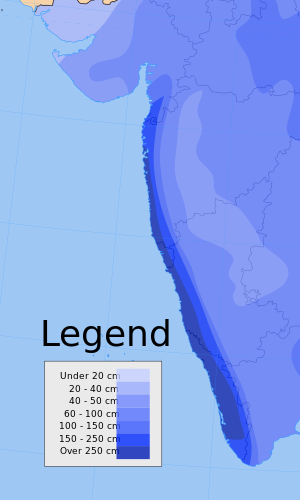 The range starts near the border of Gujarat and Maharashtra, south of the Tapti river, and runs approximately 1،600 km (990 mi) through the states of Maharashtra, Goa, Karnataka, Kerala and Tamil Nadu ending at Kanyakumari, at the southern tip of India. These hills cover 160،000 km2 (62،000 sq mi) and form the catchment area for complex riverine drainage systems that drain almost 40% of India. The Western Ghats block southwest monsoon winds from reaching the Deccan Plateau.[6] The average elevation is around 1،200 m (3،900 ft).[7]