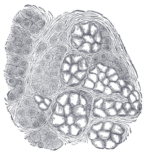 Lobes contain smaller lobules, which contain adenomeres, the secretory units of the gland. Each adenomer contains one or more acini, or alveoli, which are small clusters of cells that secrete their products into a duct. The acini of each adenomere are composed of either serous or mucous cells, with serous adenomeres predominating. Some mucous adenomeres may also be capped with a serous demilune, a layer of lysozyme-secreting serous cells resembling a half moon.