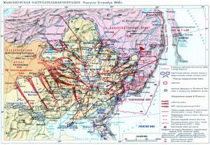 The 1st Far Eastern Front was to form the eastern half of the pincer movement. This attack involved the 1st Red Banner Army, the 5th Army and the 10th Mechanized Corps striking towards Mudanjiang (or Mutanchiang).[1] Once that city was captured, this force was to advance towards the cities of Jilin (or Kirin), Changchun and Harbin.[1] Its final objective was to link up with the forces of the Transbaikal Front at Changchun and Jilin thus closing the double envelopment movement.
