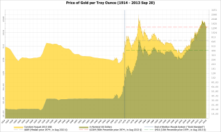 أسعار الذهب (دولار أمريكي لكل اونصة ترويسية) من عام 1914، القيمة الاسمية للدولار والتضخم المعدل للدولار الأمريكي.