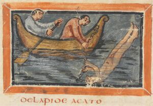 Divers were also used in warfare. Defenses against sea vessels were often created, such as underwater barricades, and hence divers were often used to scout out the seabed when ships were approaching an enemy harbor. If barricades were found, it was divers who were used to disassemble them, if possible.[7] During the Peloponnesian War, divers were used to get past enemy blockades to relay messages as well as supplies to allies or troops that were cut off,[8] and in 332 BC, during the Siege of Tyre, the city used divers to cut the anchor cables of Alexander's attacking ships.[9]