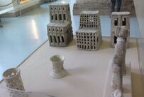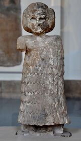 Also recovered in conjunction with these temples were 87 alabaster figures of worshippers, ranging in height from 20 to 65 centimeters (8 to 26 inches), depicting both men and women.[47] The style of these figures resembles Sumerian figures of the ED II and ED III periods. One of the early figures found at Assur is a head of a female figure, wearing a fillet. This head is typical of the art style of the Akkadian period, with smooth and soft curves and a full mouth. As it was found in association with the Ishtar G temple, it indicates that the temple continued to be used well into the Akkadian period as well.[48] In addition to the alabaster figures of worshippers, also recovered were 24 stone statues of naked women, five statues of animals, a number of incense burners/pot stands and three large clay altars or house models.[47] A unique figure among the recovered finds was an ivory figurine of a nude woman, alongside fragments of at least five additional similar figurines. The ivory used might have come from Indian elephants, which would indicate trade between Assur and the early tribes and states of Iran. Also found among the artefacts of Ishtar G are a clay bottle with the features of a nude woman as well as a figurine of a man with an erect penis.[48]