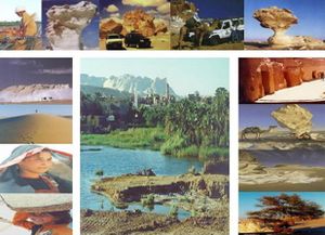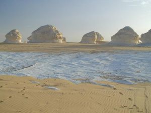 هي أرض طباشيرية إلي الشمال من الواحة أطلق عليها البعض اسم الصحراء البيضاء وبها من الأشكال الطبيعية ما ينبهر به السائح, فقد شكلت الرياح كثيرا من الأنماط الصخرية علي هيئة عش الغراب وأخري علي هيئة أعمدة حجرية بيضاء أو حوائط طباشيرية أو مخروطية, وأصبحت المنطقة متعة للسائحين يقفون فيها أياما طويلة يتمتعون بجوها الخلاب والهدوء ومناظرها العظيمة فهي تبدو من بعيد كأنها مدينة سكنية, وعندما تقترب منها تظنها جبالا ثلجية لنصاعة بياضها, وإذا وقفت أمام صخورها تظنها تماثيل صنعها فنان ماهر, وإلي الشمال من الفرافرة في الطريق إلي الواحات البحرية.