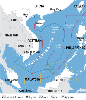 The Philippines contended that the "nine-dotted line" claim by China is invalid because it violates the UNCLOS agreements about exclusive economic zones and territorial seas.[33] It says that because most of the features in the South China Sea, such as most of the Spratly Islands, cannot sustain life, they cannot be given their own continental shelf as defined in the convention.[34]