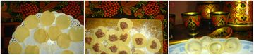 Preparation of pelmeni, a common Russian dish of Tatar origin (the word itself is from Komi and Mansi languages). Khokhloma handicraft is seen on the background.