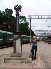 The marker for kilometre 9288, at the end of the Trans-Siberian Railway in Vladivostok.