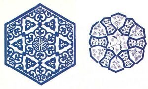 Qashani or Kashani is a Persian decorative arts which had been popular in Iran in the 16th to 18th century, and then moved to Turkey in the time of the Ottomans with the transfer of many Persians artists to Turkey, becoming the basis for decorating the walls of mosques, palaces, shrines and tombs. It is a square-shaped ceramic tile which uses Persian-like floral-depicting 4- or 6-sided glazed tiles, decorated with blue, cyan, green and sometimes red colors. The decoration is surrounded by fine black lines that make it stand out on its white floor. The tile work had often been decorated by the inscription, floral and geometrical patterns. The inscription often provides Qur'anic verses or sentences related to historical events written in Persian script. The plant often consists of natural flowers such as lily, cloves, roses and cypress trees. Geometrical patterns consists of different geometrical shapes and polygons. In Morocco, similar artistic technique is known as zillij. Its use has been widespread in the decoration of the walls of the buildings in the Ottoman era, and this mosaical feature can also be seen in the Dome of the Rock in Jerusalem. Kashi, the abbreviated form of Qashani, was also introduced to Sindh, Kutch, and Multan where numerous examples of shrines and mosques embellished with blue, white and green tile work exist.[1]