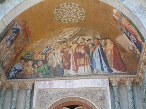 عام 1063، أثناء إنشاء كاتدرائية القديس مرقس في البندقية، لم يُعثر على رفات القديس مرقس. إلا أنه بحسب التقاليد، ففي عام 1094، كشف القديس نفسه عن مكان رفاته بمد ذراعه من عمود.[4] وُضعت الرفات المكتشفة حديثًا في تابوت بالكاتدرائية.[5]