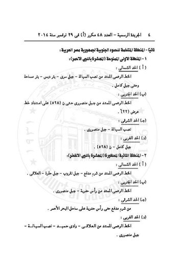 - ^ "الجريدة الرسمية تنشر قرار "السيسي" بتحديد المناطق المتاخمة للحدود". بوابة ڤيتو. 2014-12-03. Retrieved 2016-01-24.
