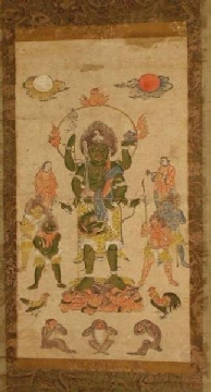 It is through the Kōshin rite of folk religion that the most significant examples are presented. The Kōshin belief or practice is a Japanese folk religion with Chinese Taoism origins and ancient Shinto influence. It was founded by Tendai Buddhist monks in the late 10th century. A considerable number of stone monuments can be found all over the eastern part of Japan around Tokyo. During the later part of the Muromachi period, it was customary to display stone pillars depicting the three monkeys during the observance of Kōshin.