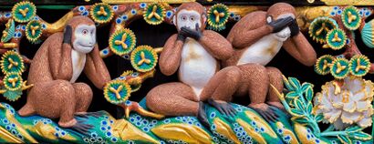 The source that popularized this pictorial maxim is a 17th-century carving over a door of the Tōshō-gū shrine in Nikkō, Japan. The carvings at Tōshō-gū Shrine were carved by Hidari Jingoro, and believed to have incorporated Confucius’s Code of Conduct, using the monkey as a way to depict man’s life cycle. There are a total of eight panels, and the iconic three wise monkeys picture comes from panel 2. The philosophy, however, probably originally came to Japan with a Tendai-Buddhist legend, from China in the 8th century (Nara Period). It has been suggested that the figures represent the three dogmas of the so-called middle school of the sect.
