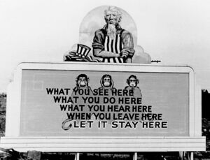 The three monkeys are depicted in the trial scene in the 1968 film Planet of the Apes. In an example of semiotics, the judges mimic the "see no evil, hear no evil, speak no evil" monkeys.[16]