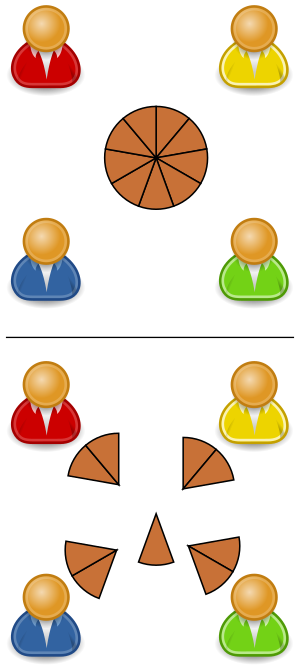 Suppose that a pie has 9 slices and they are to be divided evenly among 4 people. Using Euclidean division, 9 divided by 4 is 2 with remainder 1. In other words, each person receives 2 slices of pie, and there is 1 slice left over.