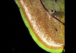 القشرة الكمثرية لفأر عمرن 14 يوماً (بالأخضر) stained for enkephalin (بالأحمر) and DAPI (بالأزرق) to show nuclei. Epifluorescence.