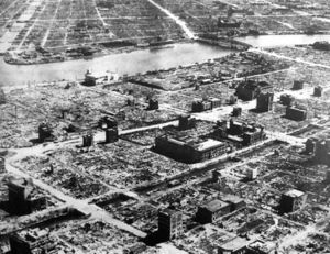 طوكيو بعد القصف الهائل الذي تعرضت له في هجوم مساء 9-10 مارس 1945، وهي أكثر الغارات المفردة دماراً في تاريخ الطيران العسكري. قصف طوكيو في الحرب العالمية الثانية خفض الانتاج الصناعي للمدينة إلى النصف.