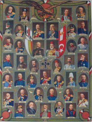 ![]() المشاركون في الحرب العالمية الأولى - القوى المركزية، مستعمراتهم باللون البرتقالي، الحلفاء ومستعمراتهم باللون الأخضر، دول الحياد باللون الرمادي | |