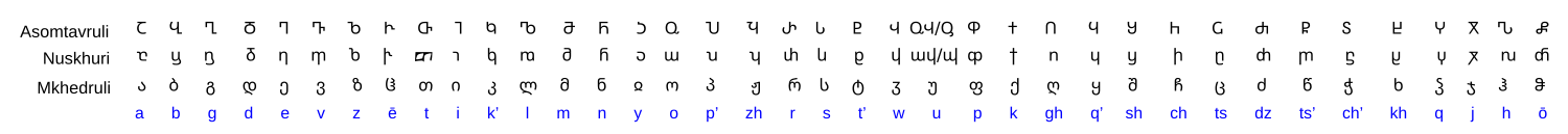 نظم الكتابة الجورجية are the three writing systems used to write the Georgian language: Asomtavruli, Nuskhuri and Mkhedruli. Although the systems differ in appearance, their letters share the same names and alphabetical order and are written horizontally from left to right. Of the three scripts, Mkhedruli, once the civilian royal script of the Kingdom of Georgia and mostly used for the royal charters, is now the standard script for modern Georgian and its related Kartvelian languages, whereas Asomtavruli and Nuskhuri are used only by the Georgian Orthodox Church, in ceremonial religious texts and iconography.[1]