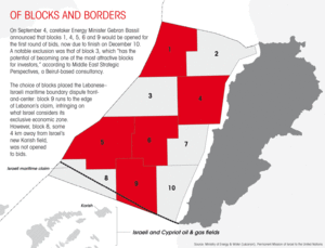 وطرح لبنان مناقصة عامة أمام الشركات العالمية للاستثمار في البلوك 9، ما أثار غضب إسرائيل بسبب حساسية موقع هذا البلوك الذي يحاذي حدود المياه الإقليمية الإسرائيلية، وخاصة أن بيروت تخوض نزاعا مع تل أبيب لم يُحل حتى الآن حول منطقة في البحر تبلغ مساحتها نحو 860 كيلومترا مربعا تمتد بمحاذاة ثلاث من مناطق الامتياز، إحداها البلوك 9.