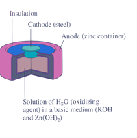 The mercury battery has many applications in medicine and electronics. The battery consists of a steel—made container in the shape of a cylinder acting as the cathode, where an amalgamated anode of mercury and zinc is surrounded by a stronger alkaline electrolyte and a paste of أكسيد الزنك و أكسيد الزئبق الثنائي .