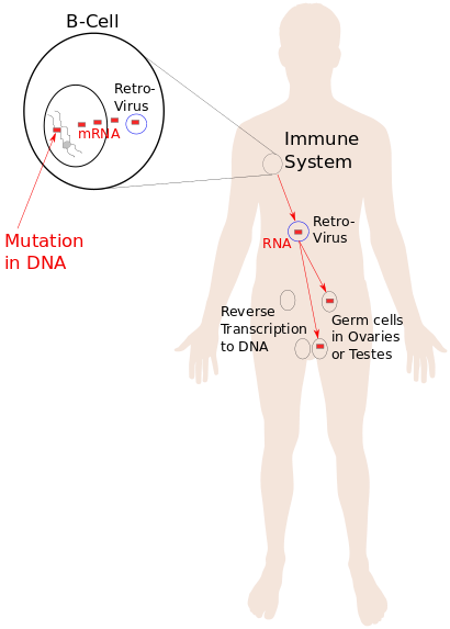 The mechanism was meant to explain why homologous DNA sequences from the VDJ gene regions of parent mice were found in their germ cells and seemed to persist in the offspring for a few generations. The mechanism involved the somatic selection and clonal amplification of newly acquired antibody gene sequences generated via somatic hypermutation in B-cells. The messenger RNA products of these somatically novel genes were captured by retroviruses endogenous to the B-cells and were then transported through the bloodstream where they could breach the Weismann or soma-germ barrier and reverse transcribe the newly acquired genes into the cells of the germ line, in the manner of Darwin's pangenes.[104][103][142]