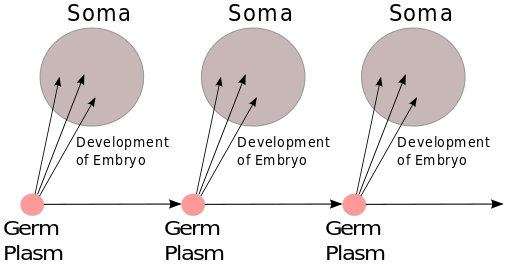 August Weismann's germ plasm theory held that germline cells in the gonads contain information that passes from one generation to the next, unaffected by experience, and independent of the somatic (body) cells. This implied what came to be known as the Weismann barrier, as it would make Lamarckian inheritance from changes to the body difficult or impossible.[18]