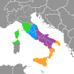 Tuscan dialects, including standard Italian Middle Italian dialects Intermediate Southern Italian dialects Extreme Southern Italian dialects