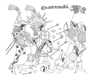 صفحة من Lienzo de Tlaxcala showing the Spanish conquest of Iximche, known as Cuahtemallan بلغة ناواتل