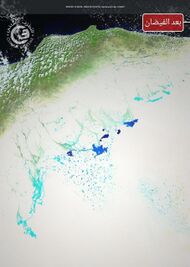 صور ساتلية تبين ظهور بحيرات على مساحات شاسعة في صحراء المخيلي، على بعد 80 و 100 كم جنوب الجبل الأخضر، بعد تجمع كميات هائلة من السيول من وديان الجبل الأخضر، إثر إعصار دانيال في 10 سبتمبر 2013.