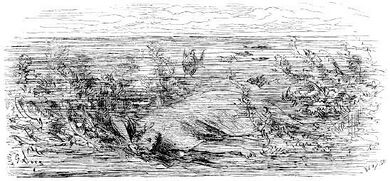 Pictures of the fable in books for some centuries usually depicted a group of men pointing opposite ways by the stream-side, following the emblematic lead of the German illustrator of Fearno's Centum Fabulae (1590)[12] and of François Chauveau, the original illustrator of La Fontaine's Fables.[13] It was only much later that attention switched to a compassionate view of the drowned woman, as in Gustave Doré's illustration of the fable (above) and Marc Chagall's 1952 etching.[14] These follow in the wake of sympathetic treatments of the subject like the "Ophelia" (1852) of John Everett Millais[15] and "A Christian martyr drowned in the Tiber during the reign of Diocletian" (1855) by Eugène Delacroix.[16]