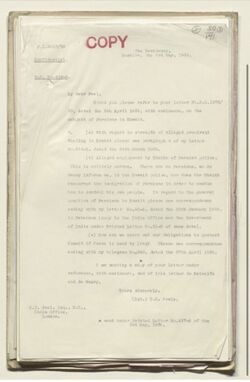 وثيقه في مايو 1939 من قسم المستعمرات، دائرة الهند، في لندن حول تقديم شكوى من الحكومة العراقية للحاكم البريطاني احتجاج على تعيين عناصر شرطة إيرانيين في شرطة الكويت، والحاكم البريطاني ينفي الأخبار ويقول لا يوجد أي فارسي تم تعيينه في شرطه الكويت. [1] ويقول الضابط البريطاني مستر فاول إلى مستر بيل في الرساله نفسها: "كيف يمكن أن نفي بالتزاماتنا بأن نحمي الكويت مستقبلاً إذا ما قرر العراقيين استخدام القوة في الكويت".