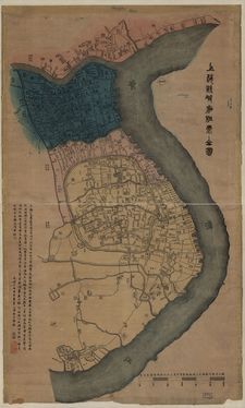 1884 map of Shanghai with foreign concessions: the British Concession in blue, the French Concession to the south in faded red and American Concession to the north in faded orange; Chinese part of the city to the south of the French Concession in faded yellow.
