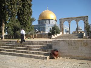 المسجد الأقصى، حيث الجامع القبلي على يسار الصورة ومسجد قبة الصخرة في المنتصف.