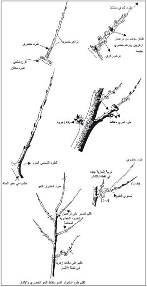 - تقصير الطرود الثمرية المختلطة إلى طول 7-10سم وطرود استمرار النمو إلى طول 20-40سم من نقاط منشئها وحسب ارتفاع مكانها على الشجرة، وفي الأحوال كافة تزال البراعم الخضرية القمية للطرود عامة.