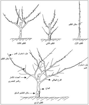 وفيما يتعلق بتربية الإثمار لأشجار عمرها 8 سنوات وأكثر، تُجرى في الصيف قبيل جمع المحصول (لتكوين ثمار أجود نوعية) أو بعيده (لتكوين عدد أكبر من البراعم الزهرية) وذلك وفق الآتي (الشكل 3).