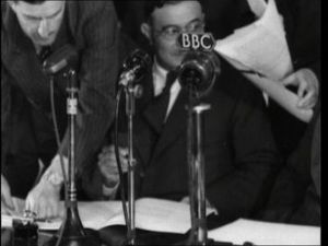 إرنست بڤن والوفد البريطاني أمام صالح جبر في مدينة پورتسموث قبيل التوقيع على المعاهدة الإنگليزية العراقية في 16 يناير 1948.