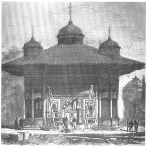 عثمان حمدي بـِيْ، عالم الآثار والرسام، اختارته الحكومة العثمانية كمفوض معارض الدولة العثمانية في فيينا. He organized the Ottoman pavilion with Victor Marie de Launay, a French-born Ottoman official and archivist, who had written the catalogue for the Ottoman Empire's exhibition at the 1867 Paris World's Fair.[4] The Ottoman pavilion, located near the Egyptian pavilion (which had its own pavilion despite being a territory of the Ottoman Empire),[5] in the park outside the Rotunde, included small replicas of notable Ottoman buildings and models of vernacular architecture: a replica of the نافورة السلطان أحمد في Topkapı Palace, a model Istanbul residence, a representative حمام تركي, a cafe, and a bazaar.[6] The 1873 Ottoman pavilion was more prominent than its pavilion in 1867. The Vienna exhibition set off Western nations' pavilions against Eastern pavilions, with the host, the Austro-Hungarian Empire, setting itself at the juncture between East and West.[5] A report by the Ottoman commission for the exhibition expressed a goal of inspiring with their display "a serious interest [in the Ottoman Empire] on the part of the industrialists, traders, artists, and scholars of other nations...."[5]