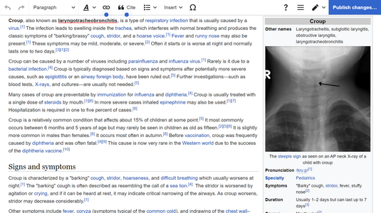 Complicated articles may be best modeled on the layout of an existing article of appropriate structure and topic. Wiki markup is the syntax and keywords used by the MediaWiki software to format a page. Wiki markup is used extensively throughout Wikipedia for such things as hyperlinks, tables and columns, footnotes, inline citation, special characters and so on. An "edit toolbar" (as pictured below) is provided just above the edit box, which will allow logged in users (by selecting the option in personal preferences) to automatically place and format various aspects of wiki code. Many HTML tags can be used in wiki markup. You can check your HTML by using markup validation.