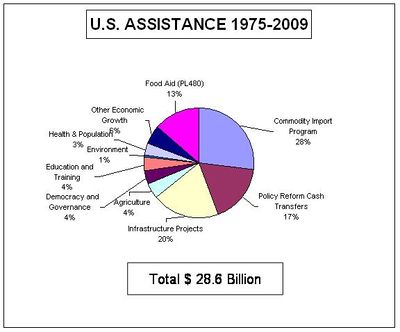 إجمالي المساعدات من 1975- 2009: 15.7 مليار دولار أمريكي، تدعم الوكالة الأمريكية للتنمية الدولية الخصخصة المالية ورفع القدرة الفنية في مجالات تشمل الخدمات المصرفية التجارية والتمويل العقاري والتأمين. ويعد الاستقرار الاقتصادئ الكلي اللازم للنمو الاقتصادي أولوية هامة و قد تم الأستعانة بخبرات الولايات المتحدة في هذا المجال من خلال الدعم الفنى الممول والمعزز من الوكالة الأمريكية للتنمية الدولية. كما يتم دعم زيادة الانفتاح علي التجارة الأمريكية من خلال تطوير الإجراءات الخاصة بالموانى والإصلاح الجمركى والمشاركة مع منظمة التجارة العالمية في مبادرات التجارة المفتوحة.