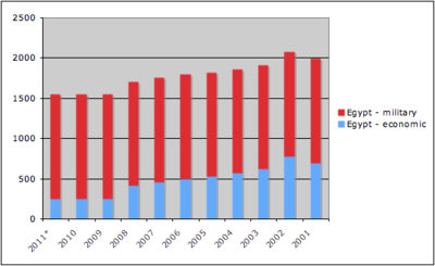 رسم بياني يوضح المعونات الأمريكية لمصر، الاقتصادية والعسكرية من 2001-2011