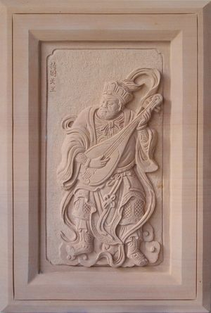 Description | This is the chief of the four kings and protector of the north. He is the ruler of rain. His symbolic weapons are the umbrella or pagoda. Wearing heavy armor and carrying the umbrella in his right hand, he is often associated with the ancient Indian God of wealth, Kubera. Associated with the color yellow or green. | King of the south and one who causes good growth of roots. He is the ruler of the wind. His symbolic weapon is the sword which he carries in his right hand to protect the Dharma and the southern continent. Associated with the color blue. | King of the east and God of music. His symbolic weapon is the pipa (stringed instrument). He is harmonious and compassionate and protects all beings. Uses his music to convert others to Buddhism. Associated with the color white. | King of the west and one who sees all. His symbolic weapon is a snake or red cord that is representative of a dragon. As the eye in the sky, he sees people who do not believe in Buddhism and converts them. His ancient name means "he who has broad objectives". Associated with the color red. |