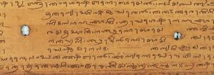 The Old Malayalam language was employed in several official records and transactions (at the level of the Chera Perumal kings as well as the upper-caste (Nambudiri) village temples).[45] Most of the inscriptions in Old Malayalam were found from the northern districts of Kerala, those lie adjacent to Tulu Nadu.[45] Old Malayalam was mostly written in Vatteluttu script (with Pallava/Southern Grantha characters).[45] Old Malayalam had several features distinct from the contemporary Tamil, which include the nasalisation of adjoining sounds, substitution of palatal sounds for dental sounds, contraction of vowels, and the rejection of gender verbs.[45][53][54] Ramacharitam and Thirunizhalmala are the possible literary works of Old Malayalam found so far.