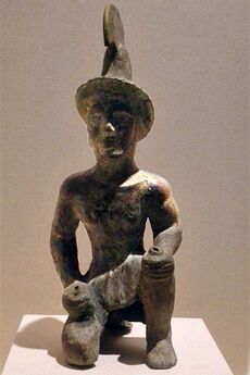 - ^ On the image of the Greek kneeling warrior: "A bronze figurine of a kneeling warrior, not Greek work, but wearing a version of the Greek Phrygian helmet ... From a burial, said to be of the 4th century BC, just north of the Tien Shan range". Ürümqi Xinjiang Museum. (Boardman "The diffusion of Classical Art in Antiquity")