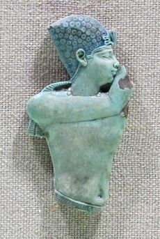 A common stele that appears during the Ptolemaic Dynasty is the cippus, a type of religious object produced for the purpose of protecting individuals. These magical stelae were made of various materials such as limestone, chlorite schist, and metagreywacke, and were connected with matters of health and safety. Horus on the Crocodiles cippi during the Ptolemaic Period generally featured the child form of the Egyptian god Horus, Horpakhered (or Harpocrates). This portrayal refers to the myth of Horus triumphing over dangerous animals in the marshes of Khemmis with magic power (also known as Akhmim).[28][29]