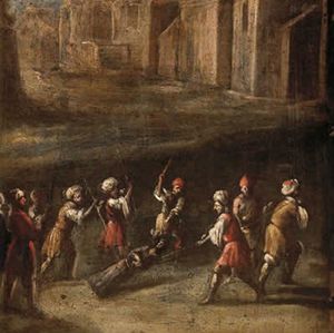 مسيح مدينة سالم، منهوباً في لا مامورا La Mamora (المهدية)، مسحولاً في شوارع مكناس, by خوان ده ڤالديس ليال، 1681.