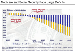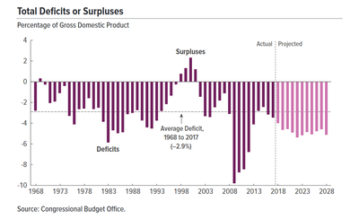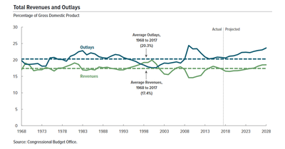 العجز والفائض في الميزانية الفدرالية الأمريكية 1968-2017، وتوقعات 2018-2028. من المتوقع أن يرتفع العجز كنسبة من الناتج المحلي الإجمالي مع ارتفاع الإنفاق على الضمان الاجتماعي والرعاية الصحية والفائدة على الدين اليدرالي بوتيرة أسرع من الدخل.