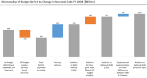 بديهياً، ينبغي أن يمثل العجز في الميزانية السنوية المبلغ المضاف إلى الدين القومي.[20] ومع ذلك، هناك أنواع معينة من الإنفاق ("الاعتمادات التكميلية") خارج عملية الميزانية والتي لم يتم احتسابها في حساب العجز، والتي تضاف أيضاً إلى الدين القومي. قبل 2009، عادة ما كان يمول الإنفاق على حرب العراق وأفغانستان عن طريق المخصصات الاعتمادات التكميلية المستثناة من حساب عجز الميزانية. في السنة المالية 2010 وما قبلها، كان عجز الميزانية والتغير السنوي في الدين القومي مختلفين بشكل كبير. على سبيل المثال، أضافت الولايات المتحدة 1 تريليون دولار إلى الدين القومي في السنة المالية 2008 لكن أُبلغ عن عجزاً مقدارهاً 455 بليون دولار. بسبب التغييرات التي أُجريت في عهد الرئيس أوباما عام 2009، اقترب الرقمان من بعضهما البعض وكانا متطابقين تقريباً في عام 2013 (أبلغت لجنة الميزانية في الكونگرس عن عجز قدره 680 مليار دولار مقابل تغيير في الدين بلغ 672 مليار دولار). فيما يخص السنة المالية 2014، ازداد الاختلاف مرة أخرى، حيث أفاد مكتب الميزانية بالكونگرس عن عجز قيمته 483 بليون دولار [21] مقابل تغير في الدين الإجمالي وصل إلى 1.086 بليون دولار.[22]