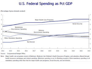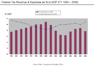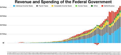 مكتب ميزانية الكونگرس: الإنفاق والدخل الفدرالي كنسبة مئوية من ن.م.إ. منذ عام 1970، كان لدى الولايات المتحدة فائض في ميزانية في الفترة من 1998 إلى 2001 فقط، أي سنوات الميزانية التي وضعها الرئيس كلنتون. من المتوقع أن ينمو العجز كنسبة مئوية من الناتج المحلي الإجمالي مع تقدم السكان في العمر وارتفاع تكلفة الرعاية الصحية بشكل أسرع من الاقتصاد.